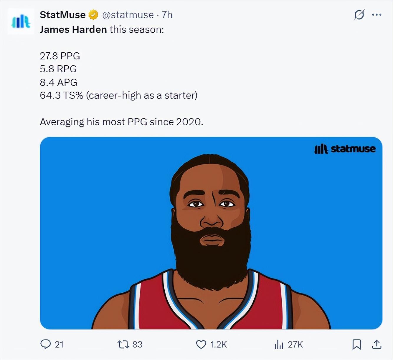 賽前數據媒體曬出哈登本賽季的數據,場均27.8分8.4助攻5.8籃板,真實命中率64.3%,得分是2020年火箭登後新高,真實命中率是生涯新高。
