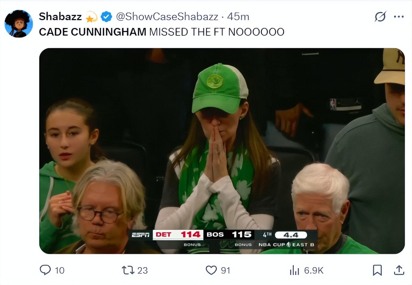 終場前4.4秒,沃爾什對坎寧安三分犯規,只要三罰全中活塞就完成絕平,CC前兩罰都命中了,在兩隊一頓換人後CC第三罰的節奏被打亂,綠凱的球迷們都在祈禱,沒想到CC真的沒有罰進。