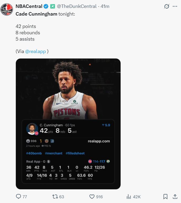 此役全場比賽坎寧安36分鐘,26中12,三分9中4,罰球16中14,拿到42分8籃板5助攻1搶斷1蓋帽,命中率46.2%,三分命中率44.4%,真實命中率63.6%,還是輸球了。