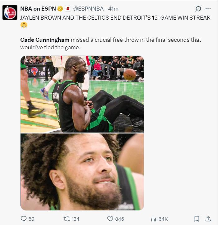 這場比賽坎寧安輸球后氣得咬牙切齒,他對自己的表現是非常不滿意,因爲他手握絕平但錯失了,就算拿到40+的高分也無濟於事,杰倫布朗拿到33分10籃板5助攻2搶斷2蓋帽纔是贏家。