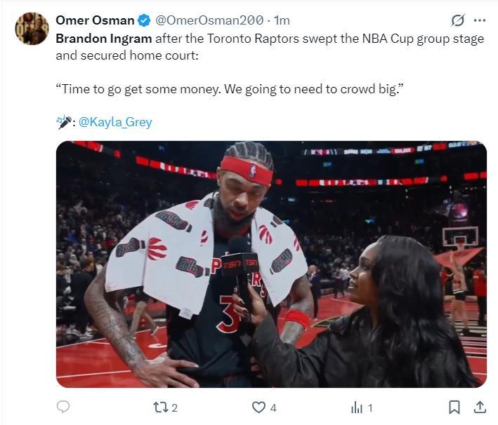 此役英格拉姆全場比賽38分鐘,23中11,三4中1,罰球5中3,拿到26分8籃板0助攻2搶斷1蓋帽,命中率47.8%,三分命中率25%,英格拉姆連續兩場比賽25+,過去9場比賽英格拉姆拿到6場20+與三場25+。
