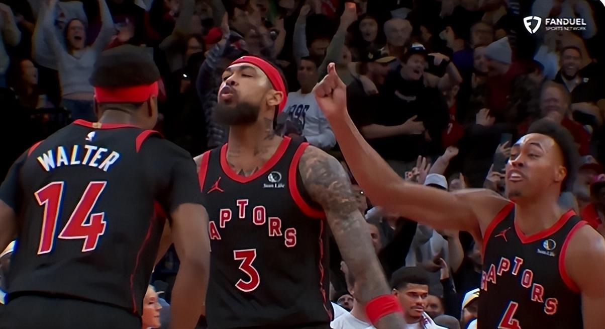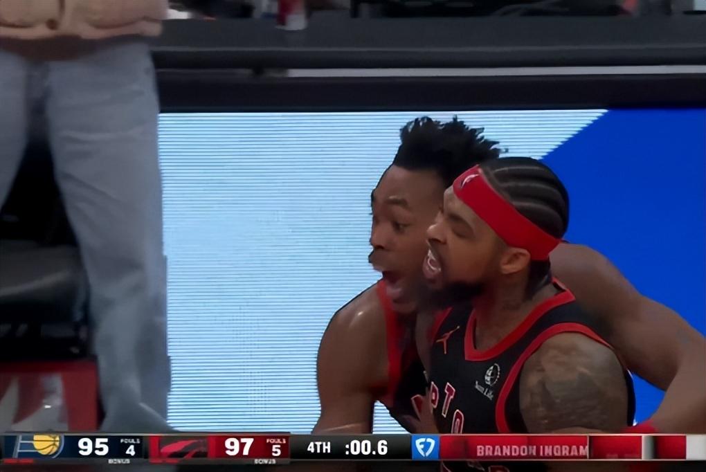 英格拉姆完成這個0.6秒中投準絕殺後表情那叫一個囂張,斯科蒂-巴恩斯也也在一旁怒吼慶祝,這個準絕殺後猛龍已經豪取9連勝。
