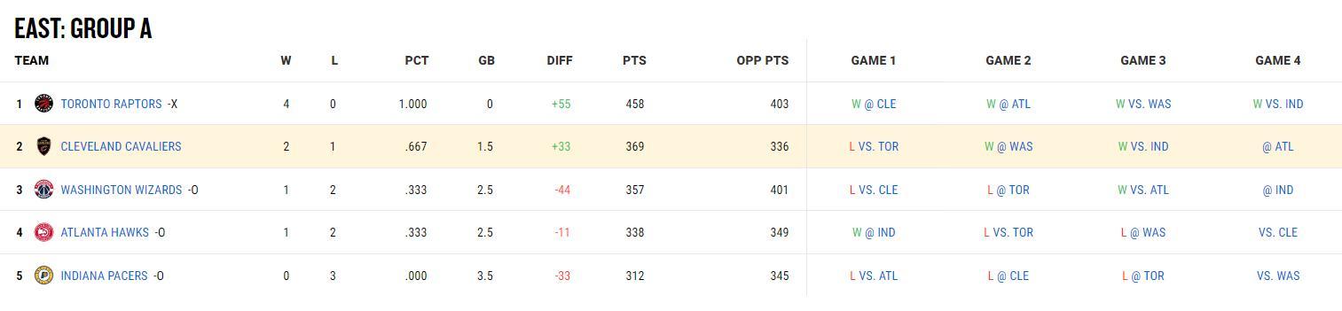 猛龍在東部的組,他們是以四連勝晉級盃賽八強,他們接連擊敗騎士、奇才、老鷹、步行者,四場比賽+55,猛龍目前已經衝到東部第二的位置。