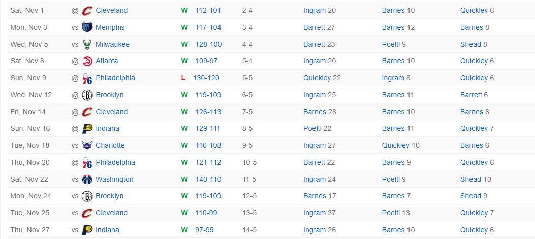 自11月1日以來猛龍取得了14戰13勝的傲人戰績,目前是一波9連勝+盃賽四連勝,猛龍的戰績僅次於活塞。