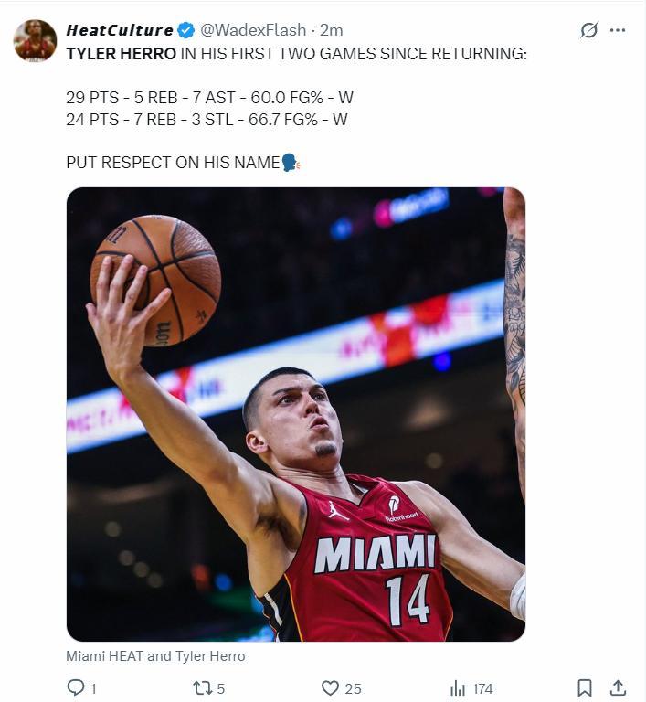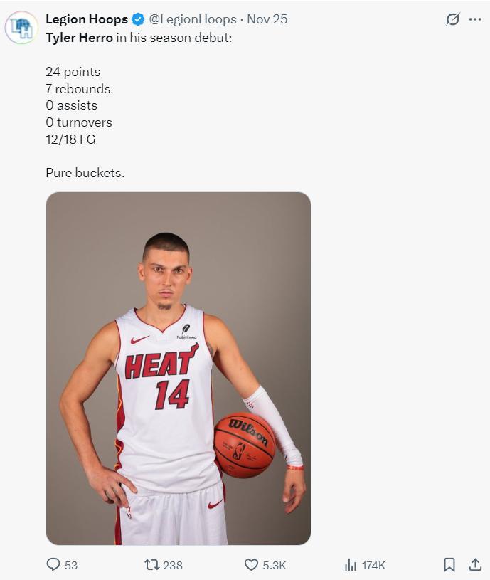 11月25日是希羅本賽季的首秀,對陣獨行俠短短29分鐘,18中12,拿到24分7籃板3搶斷0助攻,他完完全全是打開了自己的得分模式也算是恢復訓練。