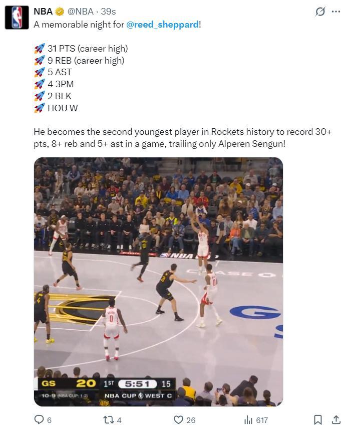 根據NBA官方的數據,謝潑德成爲火箭隊史第二年輕能單場拿到30+8籃板+5助攻的球員,最年輕的是申京。