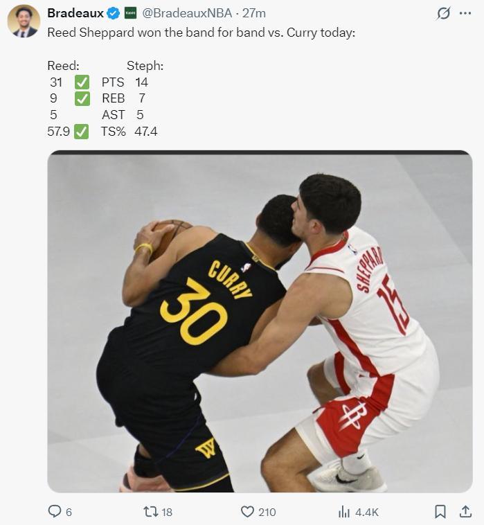 火箭記者Bradeaux曬出謝潑德與庫裏的數據,謝潑德得分呢、籃板、真實命中率都超過庫裏,這場比賽庫裏只有14+7+5+真實命中率47.4%。
