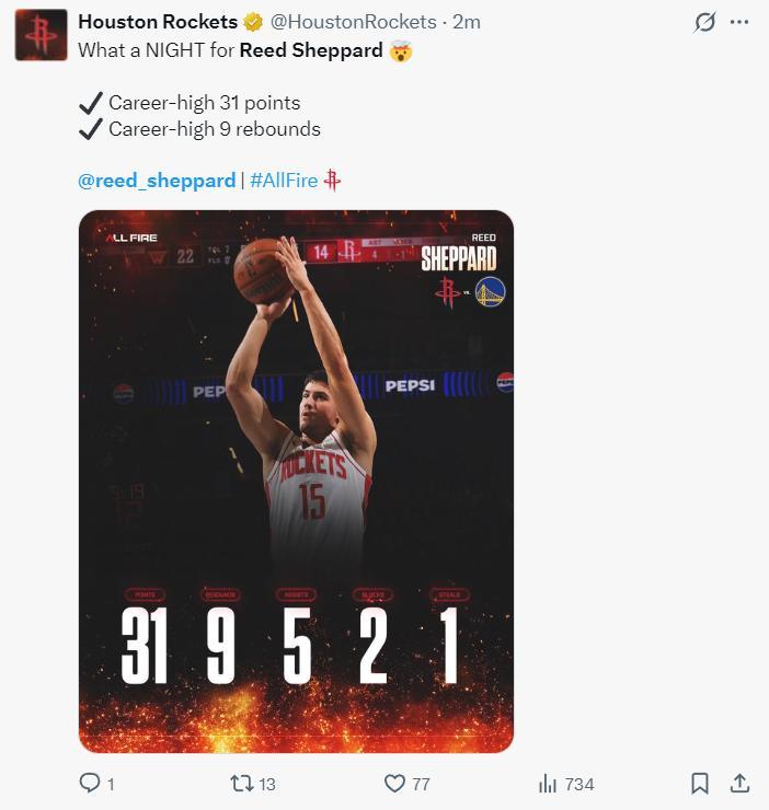 火箭隊官方也曬出了謝潑德的數據,31分9籃板5助攻2搶斷1蓋帽,謝潑德是如此的全面,他本賽季的進步太快了。