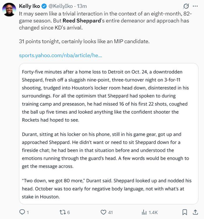 火箭記者凱利-伊科寫道:在過去八個月裏82場比賽中,謝潑德爆發一場或許微不足道,但自從杜蘭特到來後,謝潑德的打球態度、積極性、打法都發生了變化,他似乎有了MIP的可能性。