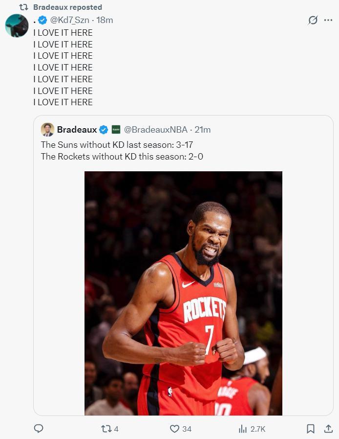 上賽季沒有杜蘭特的太陽戰績3勝17負,而本賽季KD缺席的兩場比賽火箭接連擊敗太陽、勇士。