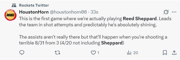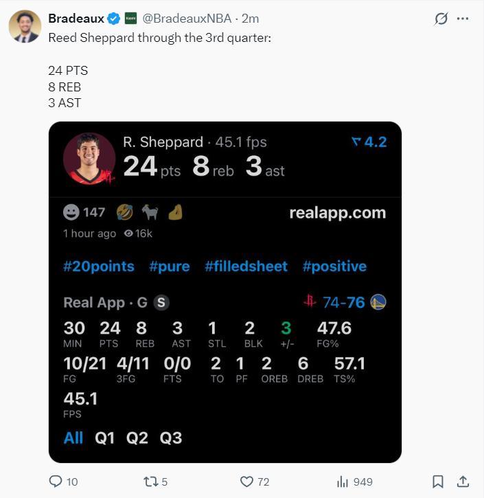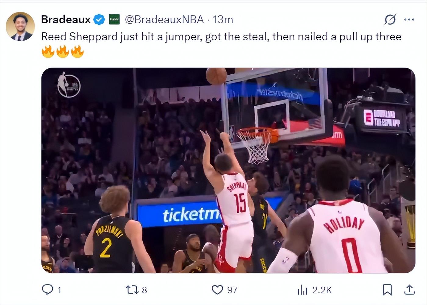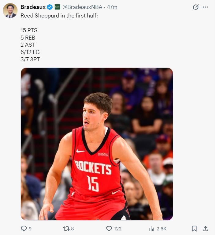 休媒:我的意思是,裏德-謝潑德實際上爲火箭隊做了所有的事情。他能得分,能傳球,能防守,還能搶籃板。