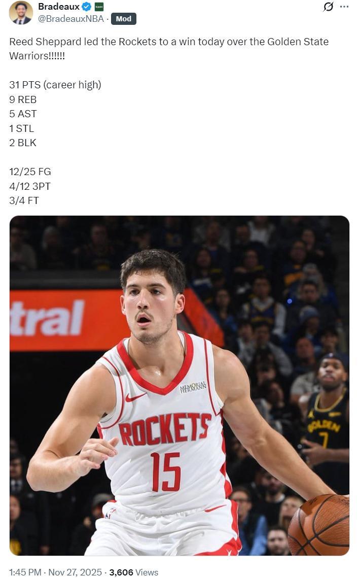北京時間11月27日,NBA盃賽,火箭隊104-100擊敗勇士拿到二連勝,這場比賽對於謝潑德來說又是生涯之夜,31分生涯新高,單場25次出手、12個運動戰、12次三分出手、9籃板都是生涯新高,也就是單場5個生涯新高。