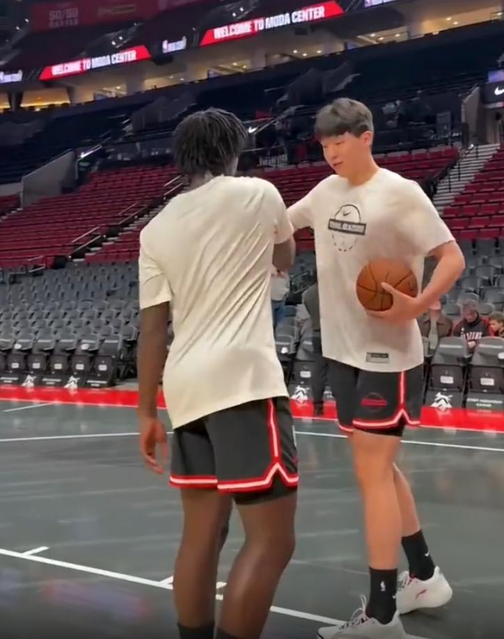 開拓者官方賽前曬出楊瀚森在主場訓練備戰馬刺的視頻。