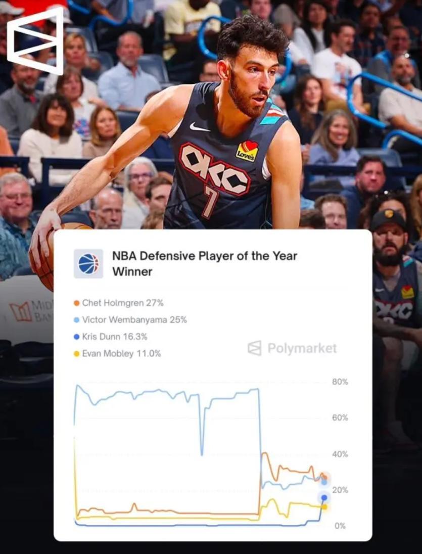 根據美媒Legion Hoops報道:切特-霍姆格倫在Polymarket平臺上已超越維克托-文班亞馬,成爲年度最佳防守球員獎項的最熱門人選。(文班亞馬因爲小腿傷勢繼續缺席)
