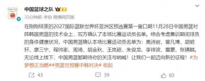 北京時間11月27日,中國籃球之隊官方宣佈,中國VS韓國世界儀亞洲區預選賽第一個窗口期的12人大名單:高詩巖、曾凡博、胡明軒、廖三寧、程帥澎、周琦、胡金秋、王嵐嶔、朱儁龍、李祥波、雷蒙、張鎮麟。