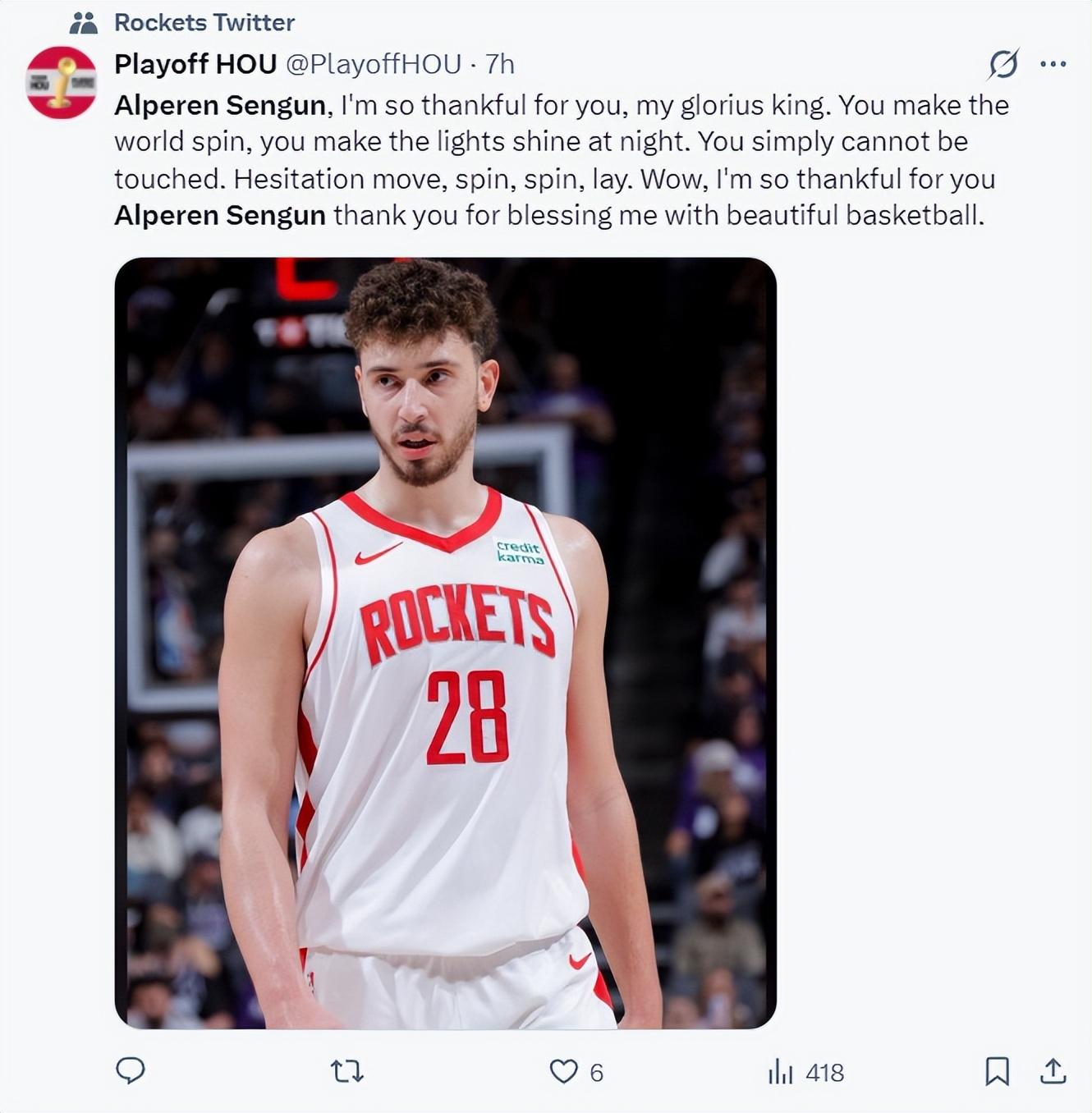 美國的火箭媒體就一直鼓勵、讚揚他:申京我對你感激不盡,你是我們榮耀之王,你無懈可擊,猶豫步、轉身上籃,感謝你來這裏打球,讓我們看到美妙的籃球。