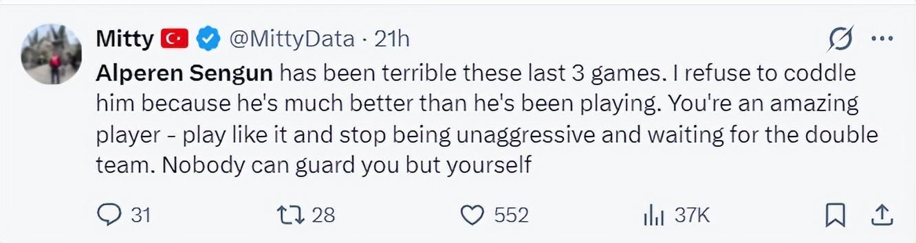申京一個20出頭的小夥子,剛剛幫助土耳其在歐錦賽上拿到亞軍創造隊史最佳戰績,且申京入選歐錦賽第一陣容,上賽季已經是NBA全明星,這樣的球員就是宣傳自己國家隊的美食、美酒、旅遊業就遭到網暴,他的狀態下滑也很正常。