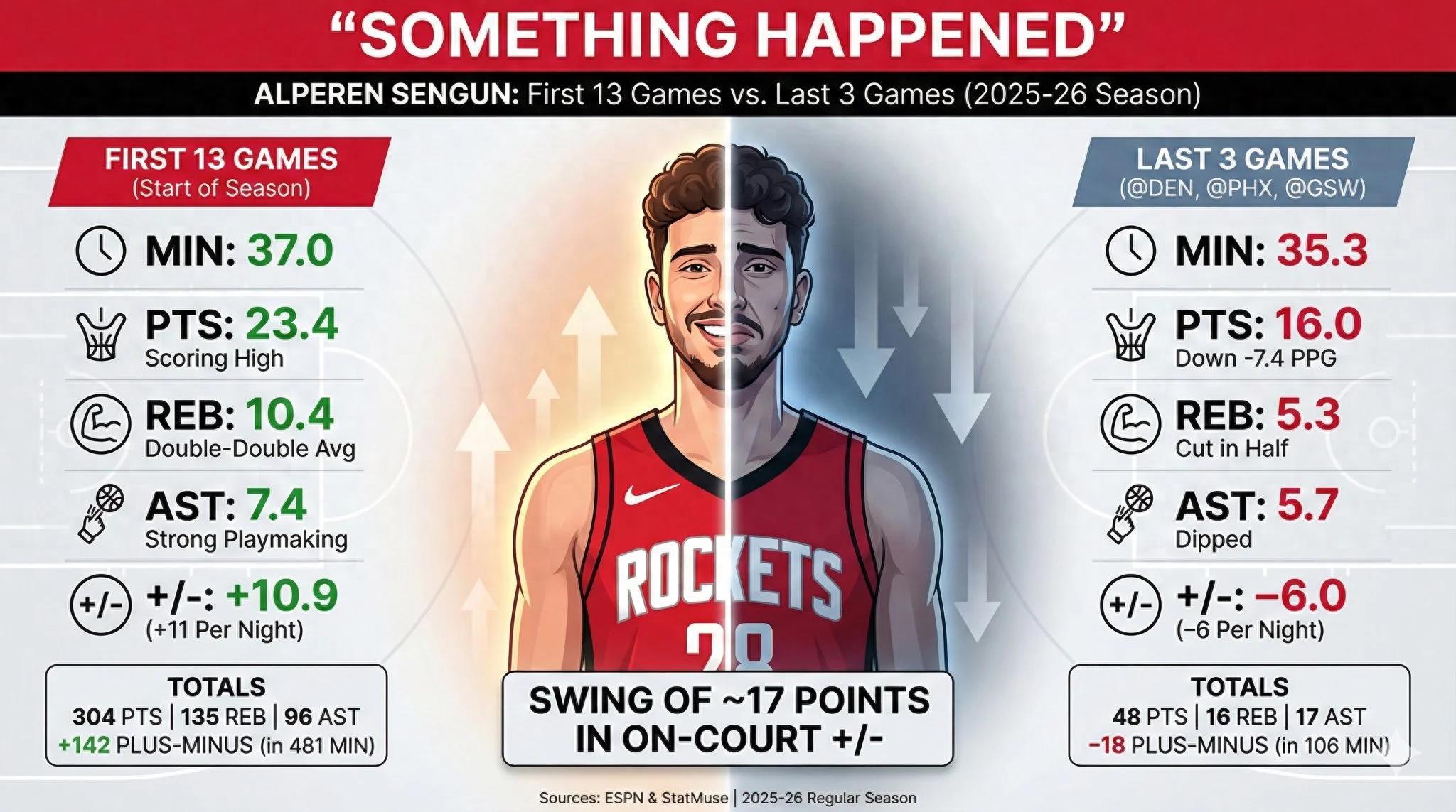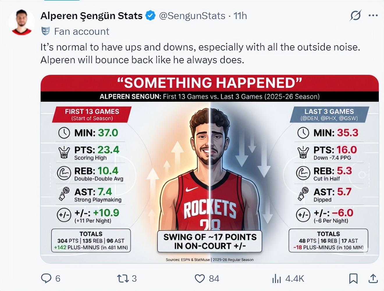 休媒曬出了一張圖,申京最近三場比賽場均35.3分鐘拿到16分5.3籃板5.7助攻,正負值-6,三場比賽合計-18。前13場比賽場均37分鐘,拿23.4分10.4籃板7.4助攻,正負值+142。