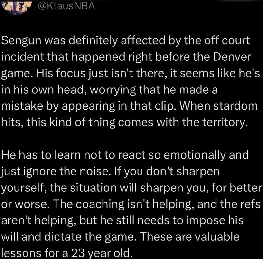 美國記者的說法:申京很明顯受到了對陣掘金賽前那件事的影響,他現在打球心不在焉,似乎一直在想該不該出現在那段視頻中,宣傳土耳其的美食、美酒是否正確,當名聲大了後這種事很難倖免。