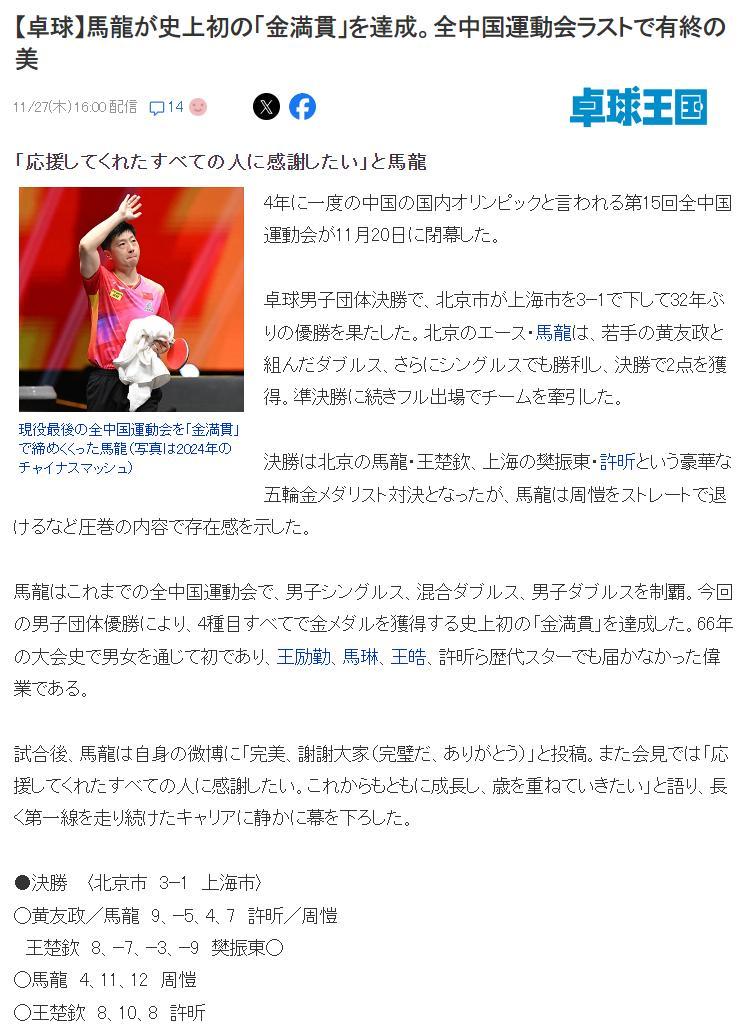 北京時間11月27日,日本媒體《乒乓球王國》發文祝賀馬龍在第十五屆全運會拿到冠軍,標題是馬龍達成史上首次全運會金滿貫,在中國全運會最後一場比賽也很完美。
