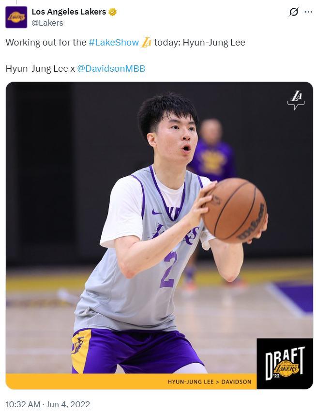 或許很多人忘記了,2022年李賢重曾到湖人隊進行過試訓,這位身高2.01米的NCAA投手真的很有實力。