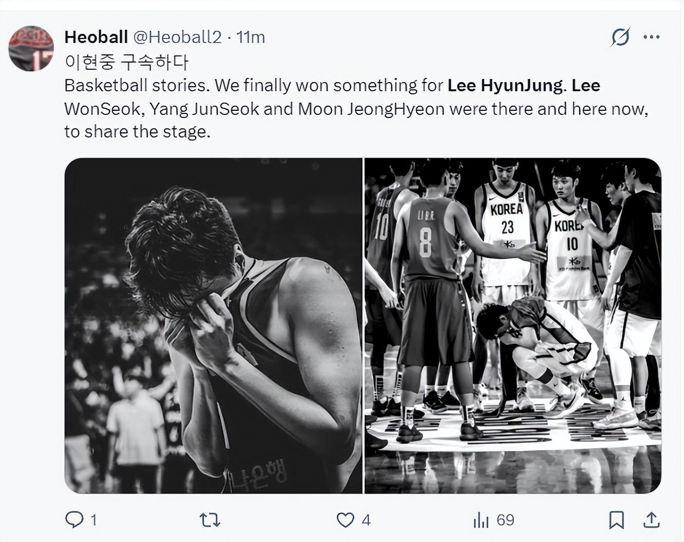 末節李賢重第八個三分也來了,不得不說中國隊的防守實在是太過於拉胯,進入比賽最後4分鐘李賢重第九個三分球也來了。中國隊縮小到5分還是李賢重挺身而出,他命中了一個拋投。