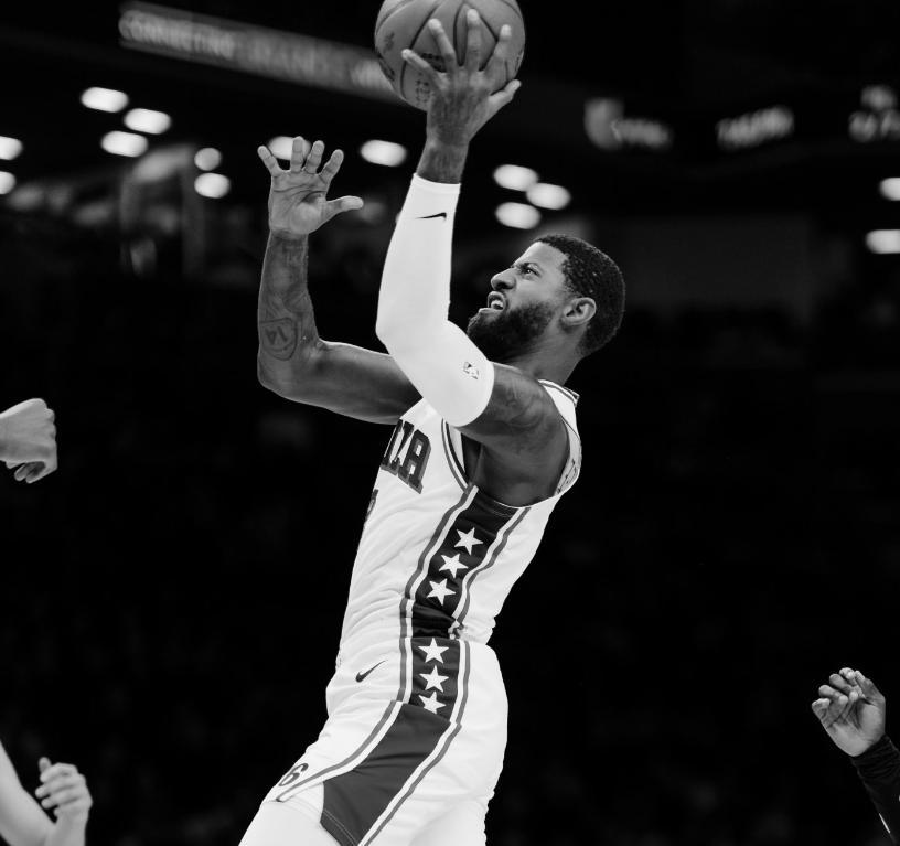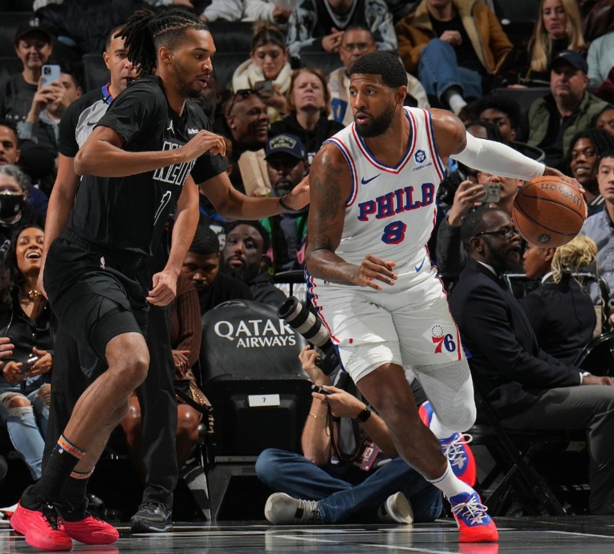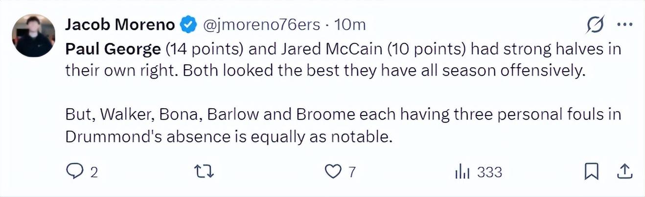 費城記者盛讚喬治半場14分、魔仙哥半場10分很出色,喬治半場8中6拿14分是目前半場得分新高。