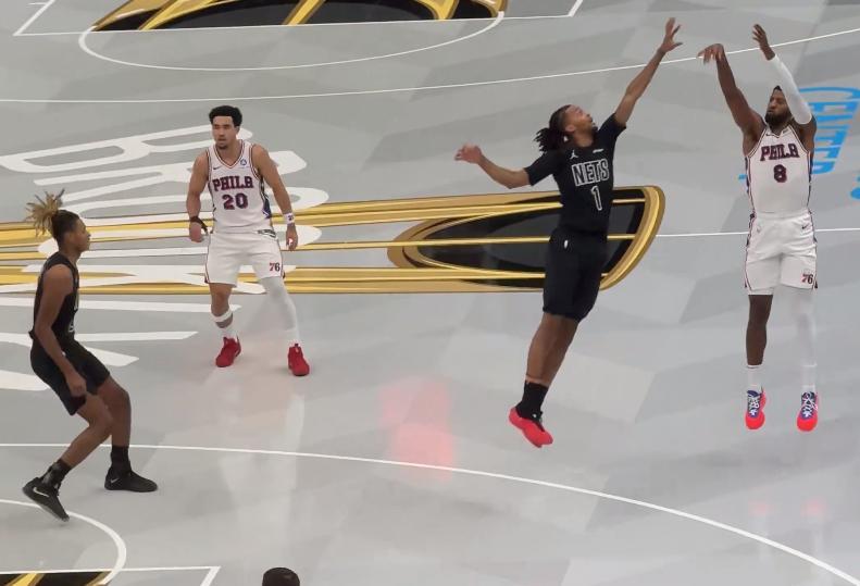 末節籃網的主力還在場,費城不敢大意繼續讓馬克西、格蘭姆斯、巴洛等人打,進入最後2分鐘兩隊的分差還有10分以上,喬治肯定不會登場了,馬克西持球推進還剩20秒耗時間不打了,比賽完結