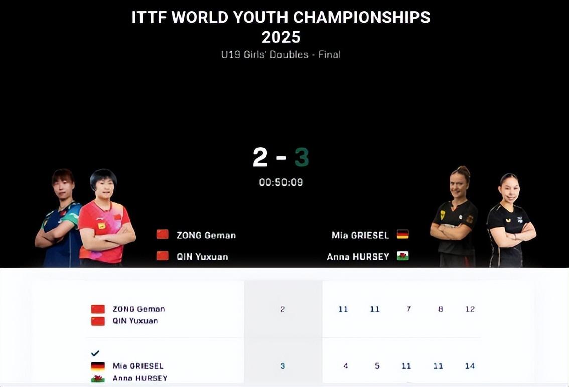 早些時候在U19女單決賽上,縱歌曼/覃予萱2-3惜敗格里塞爾/赫西屈居亞軍,五局比分:11-4,11-5,7-11,8-11,12-14。這場比賽覃予萱/縱歌曼明顯是輕敵了,大比分2-0領先被逆轉。