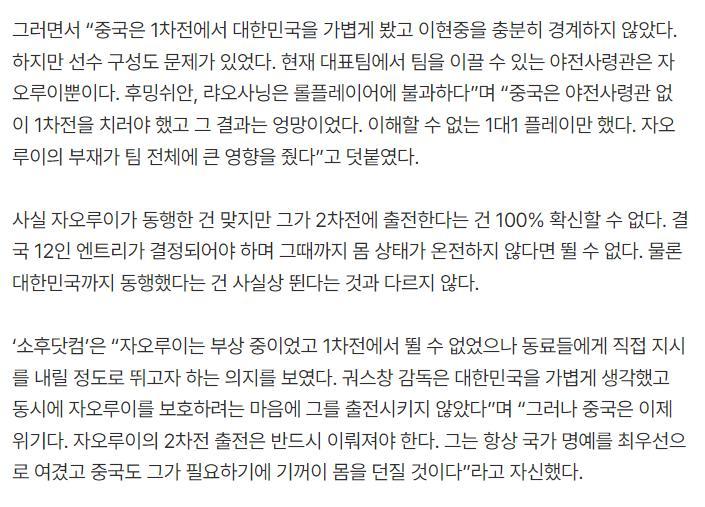 趙睿認爲中國隊在第一場交手中有些輕敵,沒有充分重視李賢重,球隊的組織串聯也較爲混亂,趙睿只要登場就能改善許多細節方面的問題。中國媒體也明白趙睿對於這支球隊來說意味着什麼,趙睿更是將國家榮譽放在第一位的選手,中國隊現在也需要他挺身而出。