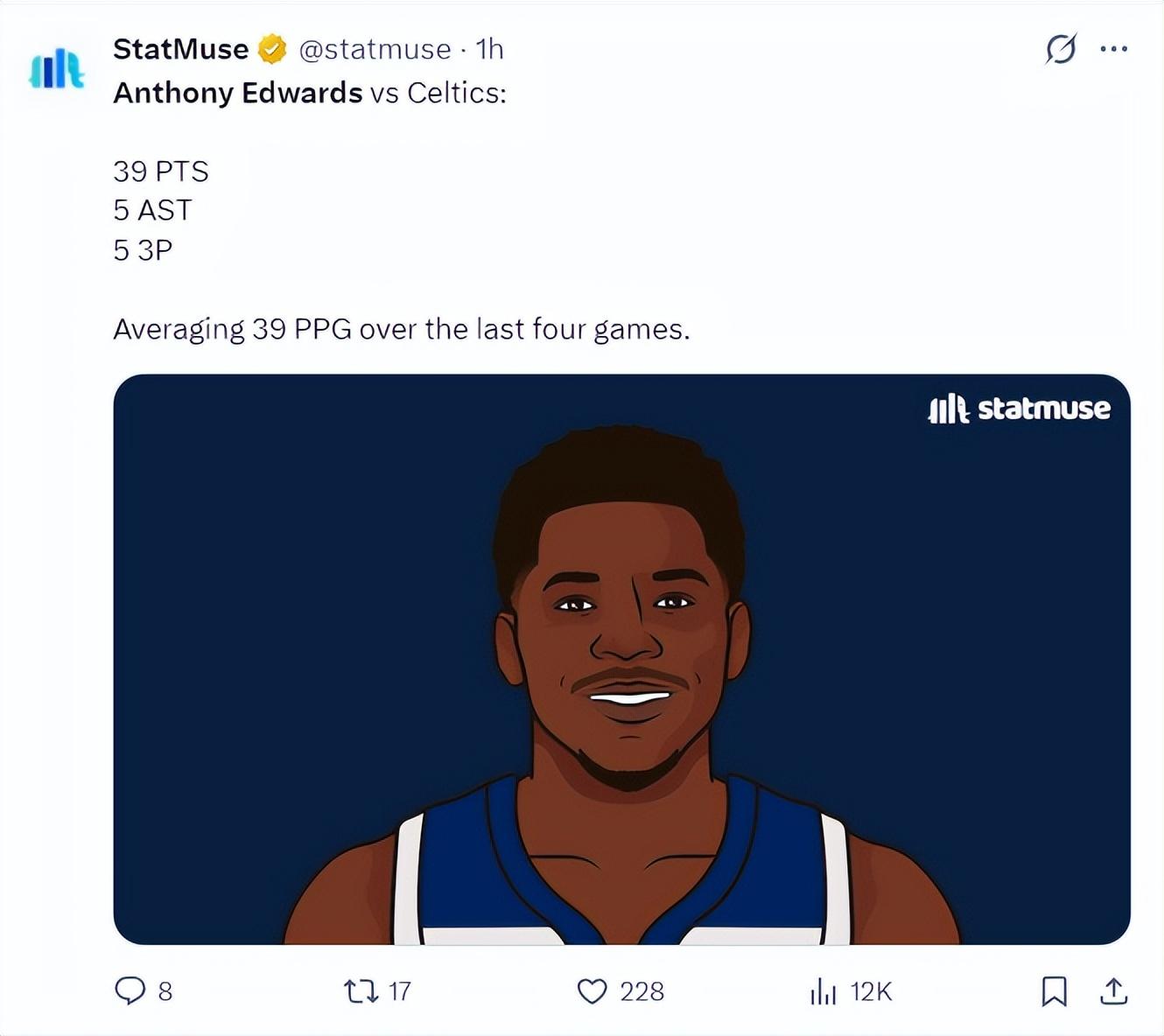 過去四場比賽,愛德華茲場均39.5分鐘,拿到38.5分5.5籃板4.5助攻1.8搶斷0.8蓋帽,命中率53.1%,三分命中率46.5%,這個登場時間與得分說明愛德華茲打得太累了。