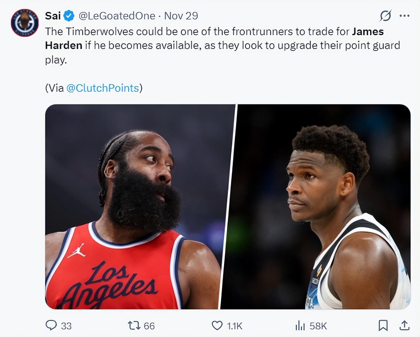 一天之前,美媒Clutchpoints報道,如果快船願意交易詹姆斯-哈登,那麼森林狼會成爲追逐哈登的球隊之一,森林狼希望補強控球后衛來爲華子減壓。