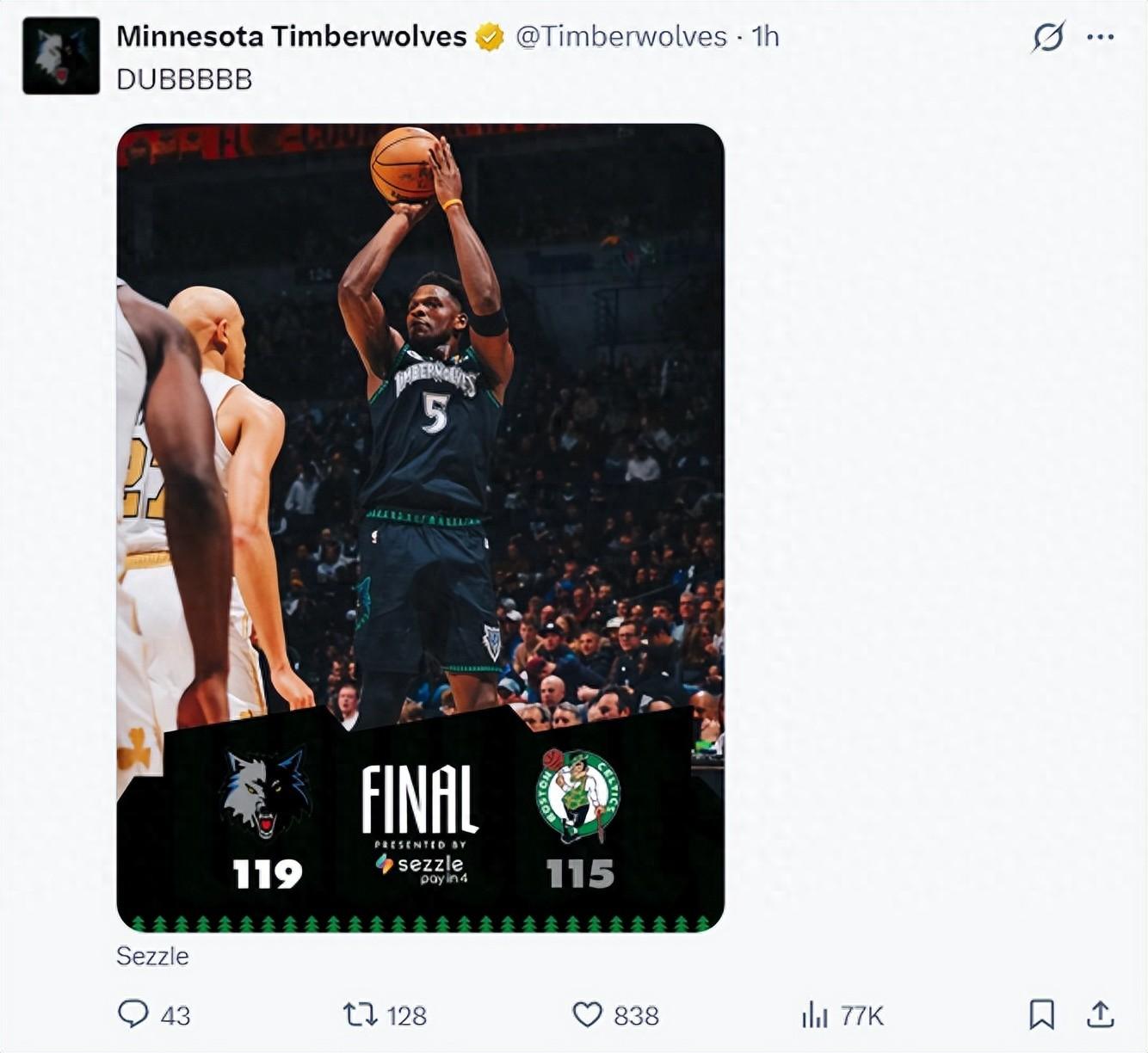 北京時間11月30日,森林狼119-115險勝凱爾特人結束漫長的三連敗。這場比賽森林狼在客場是逆轉取勝,森林狼一度落後綠凱12分之多,在第三節追回失分,末節進入決勝時刻華子完成神之一手三分鎖定勝局。