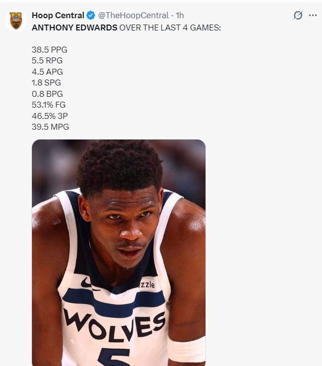 過去的四場比賽愛德華茲分別拿到39+5+2、31+8+5、43+7+4、41+5+4,但森林狼只拿到1場勝利,蘭德爾本賽季的狀態穩定性極差,他都算不上球隊的第二巨頭了。