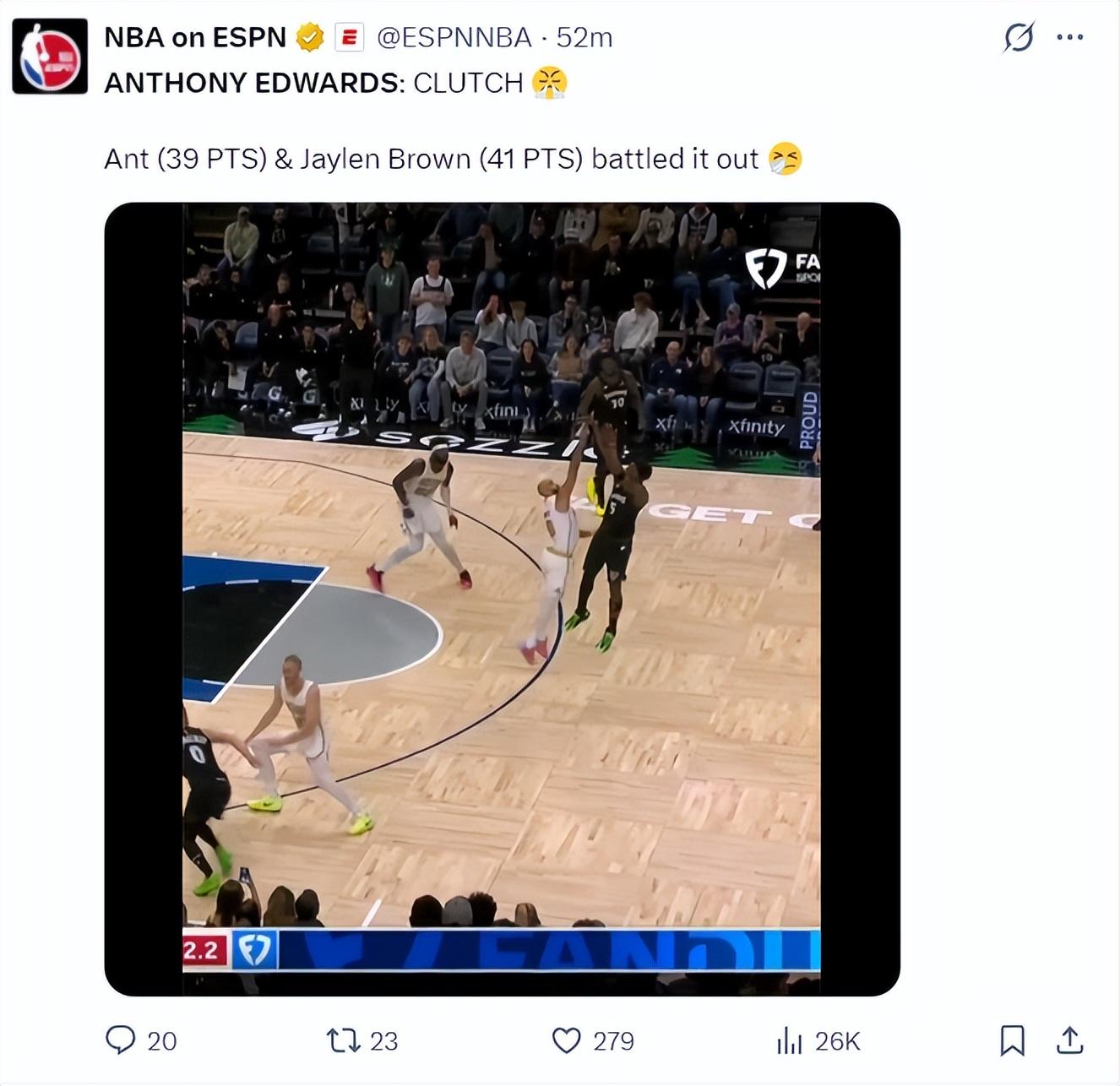 終場前14秒愛德華茲面對 懷特險些被搶斷,他從地上撿起球后直接後仰三分出手命中,這一球后森林狼領先到6分鎖定勝局,進入最後44秒愛德華茲兩個罰球+1個三分幫助球隊拿到勝利。