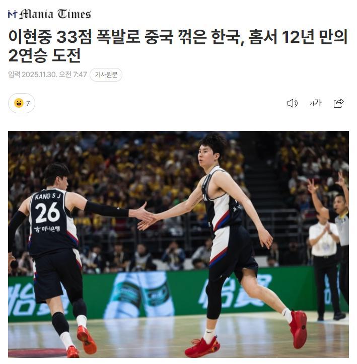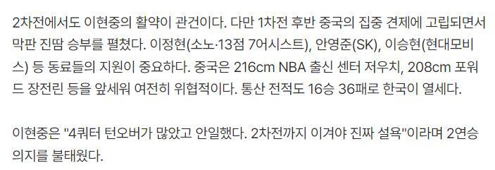 韓國媒體《狂熱時報》展望中國VS韓國的世預賽二番戰:12年來首次挑戰二連勝中國隊,李賢重首戰拿到33分。