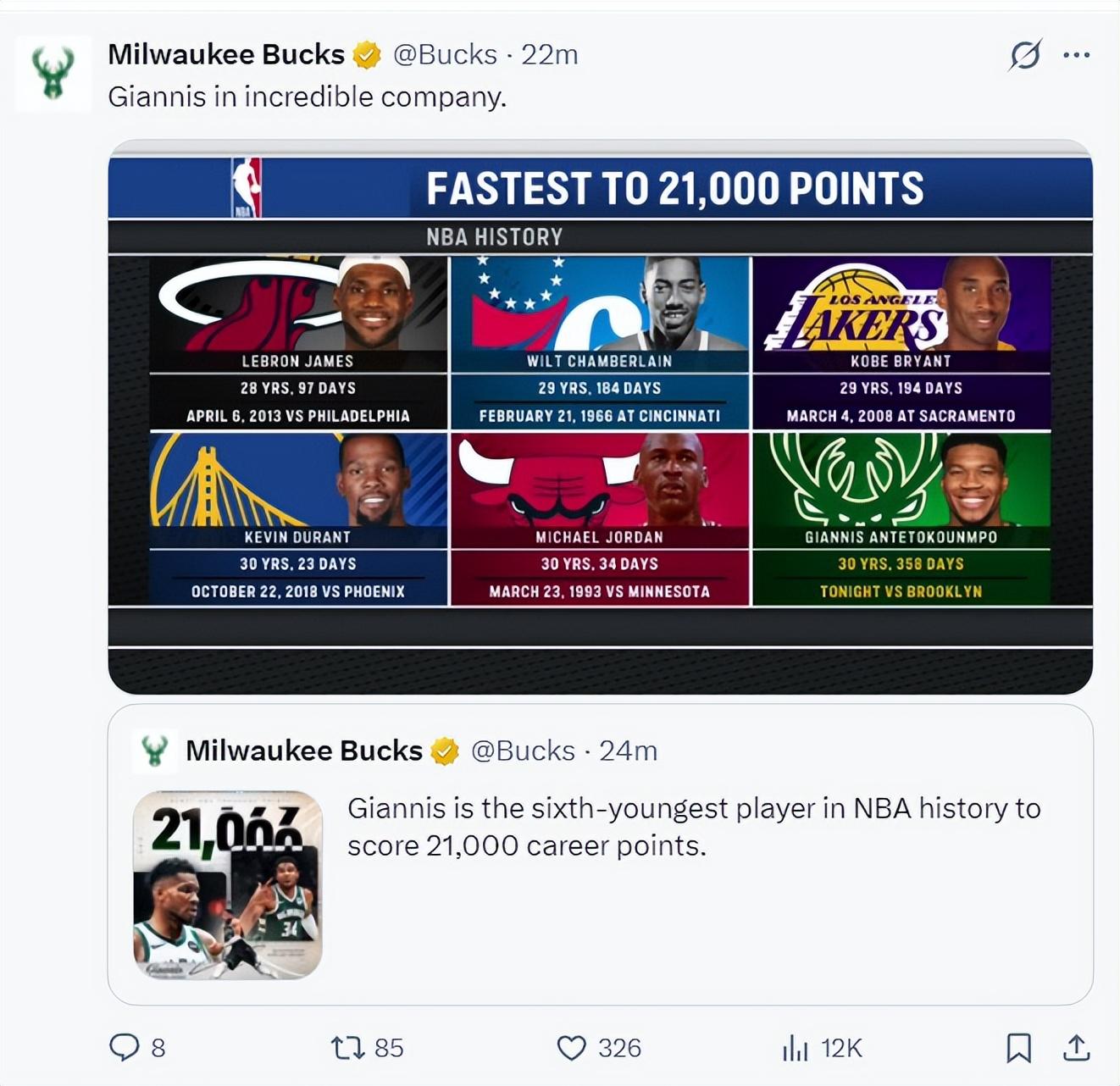 雄鹿官方曬圖:揚尼斯30歲358天拿到21000分歷史第六年輕,僅次於詹姆斯28歲97天,張伯倫29歲184天,科比29歲194天,杜蘭特30歲23天,喬丹30歲34天。