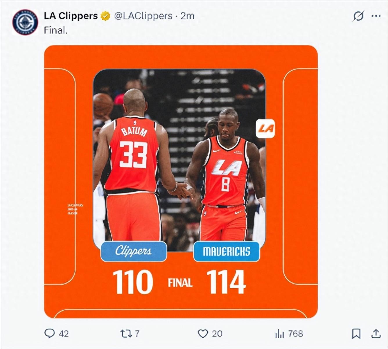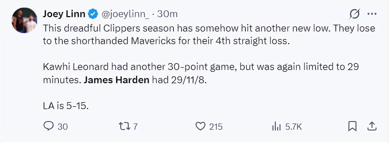 賽後快船記者Joey Linn寫道:這支糟糕的快船隊似乎又刷新了他們的下限,他們居然輸給了陣容不整的獨行俠,已經吞下一波四連敗。萊昂納德雖然發揮出色拿到30分,可他的登場時間被控制在30分鐘以內,哈登則拿到29分11籃板8助攻。