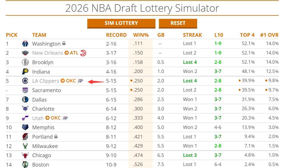 快船最慘烈的地方在哪裏?最慘烈的地方在於2026年的首輪籤還不在自己手中,快船已經跌至西部倒數第二,目前5勝15負,他們前四籤的概率已經高達39.9%,狀元籤概率都有9.8%,雷霆隊有希望笑納一個前五順位的超級新星。