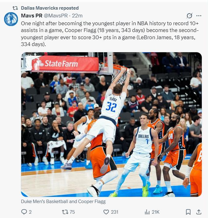 上一場比賽弗拉格剛剛打破詹姆斯最年輕的單場助攻上雙紀錄,這場比賽又打破詹姆斯最年輕的單場35+紀錄,不得不說弗拉格這個美國之子的確天賦異稟,獨行俠以他建隊的思路肯定沒錯的。