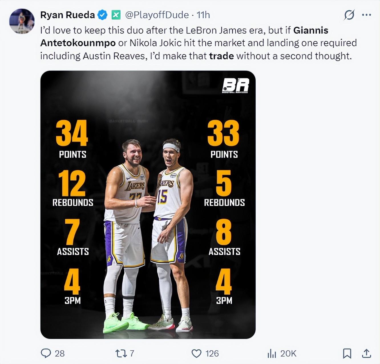 你們會發現從上個月開始,各隊的記者、媒體都在觀望揚尼斯的動向,湖人記者Ryan Rueda就在暢想揚尼斯聯手東契奇、裏夫斯的畫面,他認爲揚尼斯是詹姆斯最好的替代者。