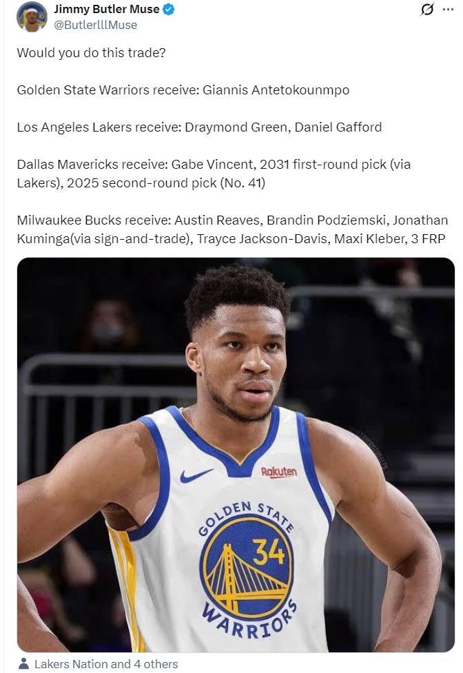 值得一提的是勇士媒體也希望能得到揚尼斯,他們模擬了湖人、勇士、獨行俠、雄鹿四方大交易。