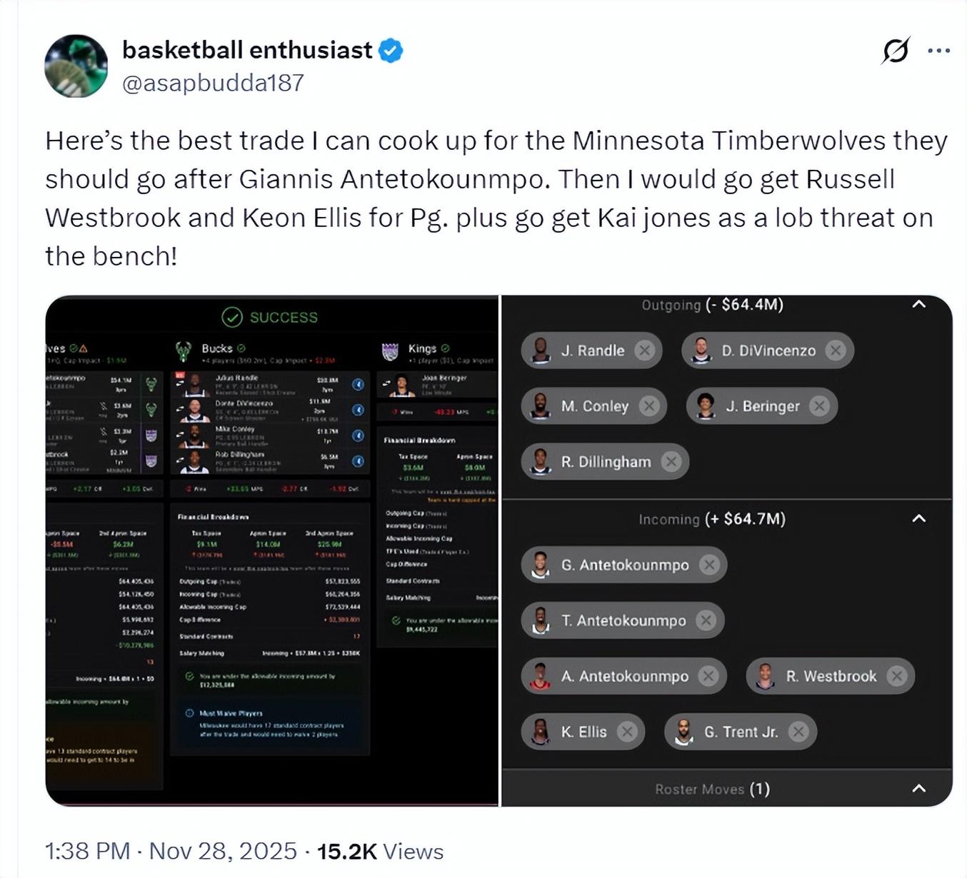 森林狼的媒體也希望能交易得到揚尼斯,他模擬了 雄鹿、森林狼、國王三方交易。