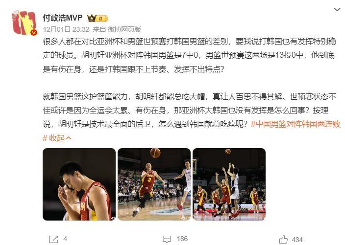 付政浩:胡明軒有傷在身嗎?防守跟不上韓國腳步,進攻發揮不了作用,胡明軒是技術最全面的後衛,怎麼打韓國如此喫癟?最近三次打韓國胡明軒是19中0。