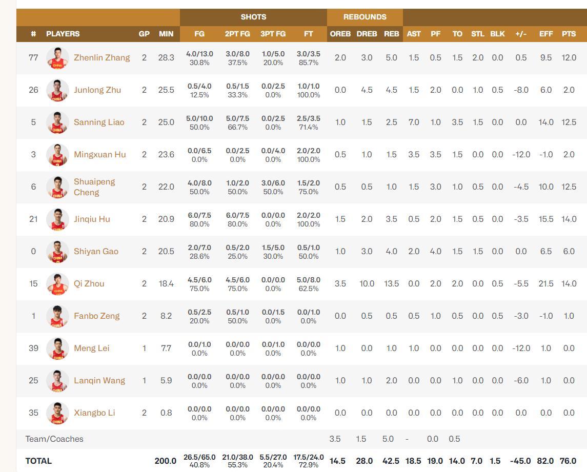 兩場比賽結束,男籃命中率在50%以上的球員只有廖三寧、胡金秋、周琦、程帥澎,場均得分上雙的只有:廖三寧、張鎮麟、周琦、胡金秋、程帥澎。高詩巖、胡明軒兩個後衛表現非常之差,胡明軒承受了更多的批判壓力。