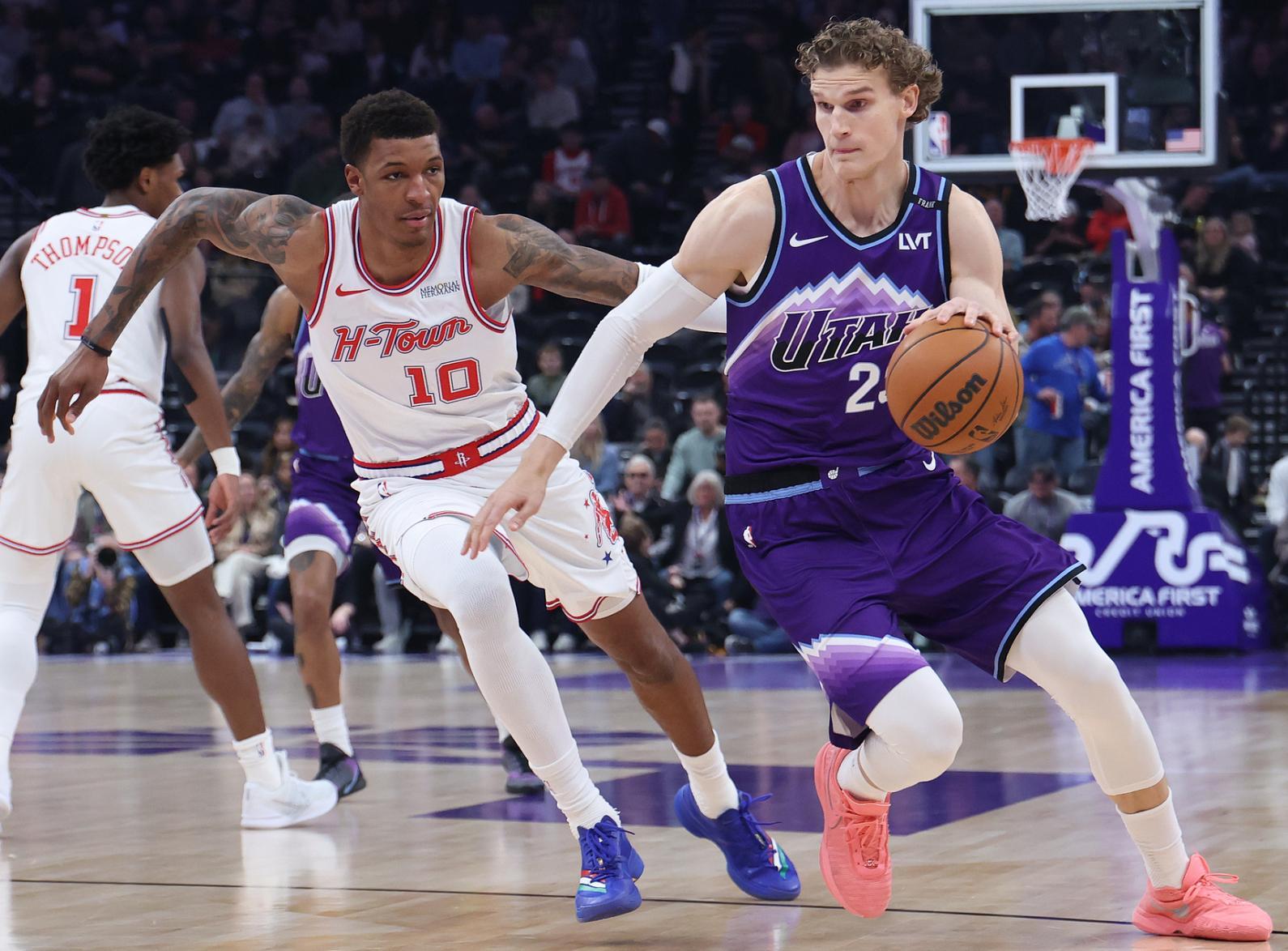 兩隊的一番戰火箭是完全壓制爵士,這場二番戰哈迪教練立馬就改變了球隊的戰術,努爾基奇在場會拖累球隊的防反速度就少用,上半場弩機只打11分鐘,菲利波夫斯基上半場打了14分鐘,他的效果明顯比努爾基奇更好,喬治也掃去了單場6中0拿0分的陰霾,上半場13分3籃板2助攻還隔扣小賈。