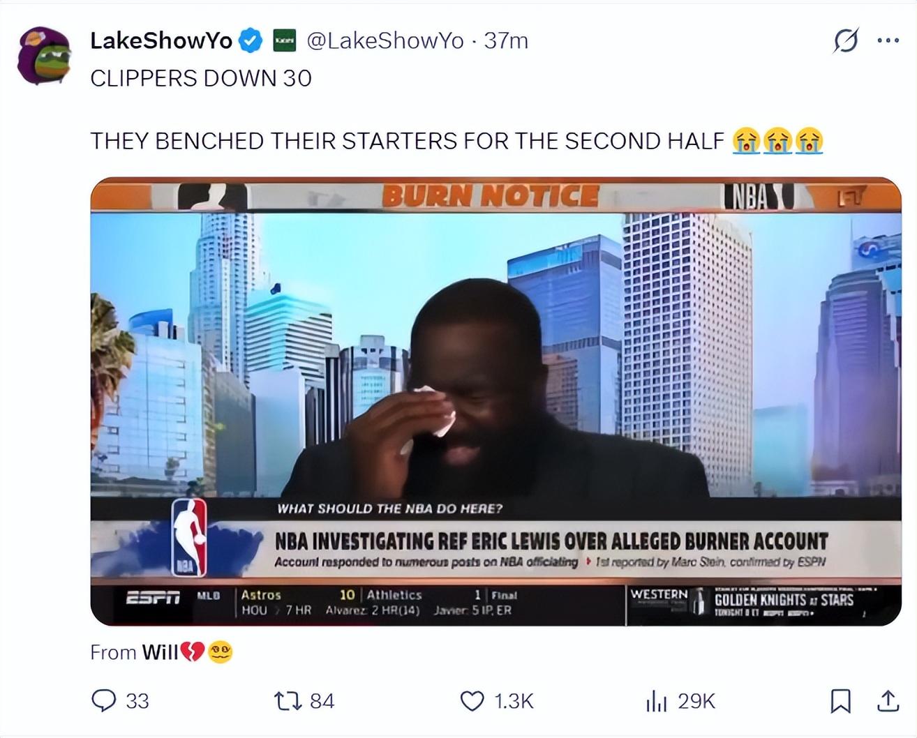 湖人媒體LkaerShowYo曬出帕金斯假哭的視頻寫道:快船以30分的差距換下了主力。三個哭臉,這分明是幸災樂禍。