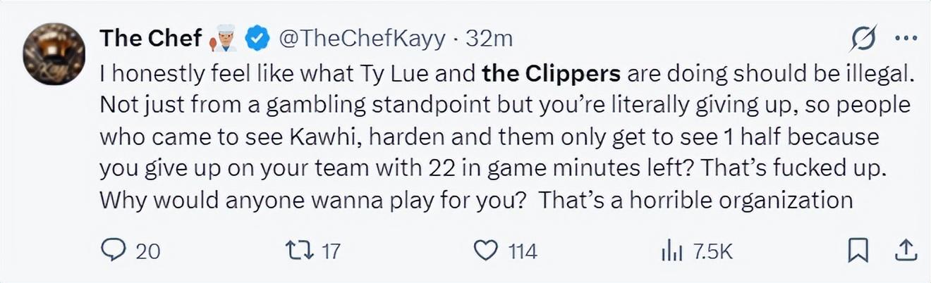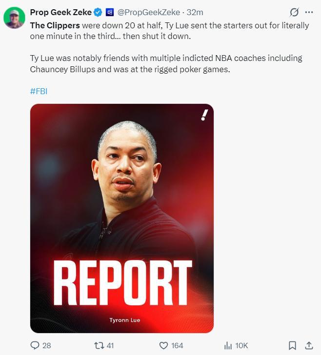 美記Prop Geek Zeke寫道:快船半場落後20分,第三節剛開場1分鐘泰倫盧就換下主力叫停比賽。提醒大家,泰倫盧與多位被起訴賭博的主教練的關係密切,他也參與了那些撲克遊戲。。