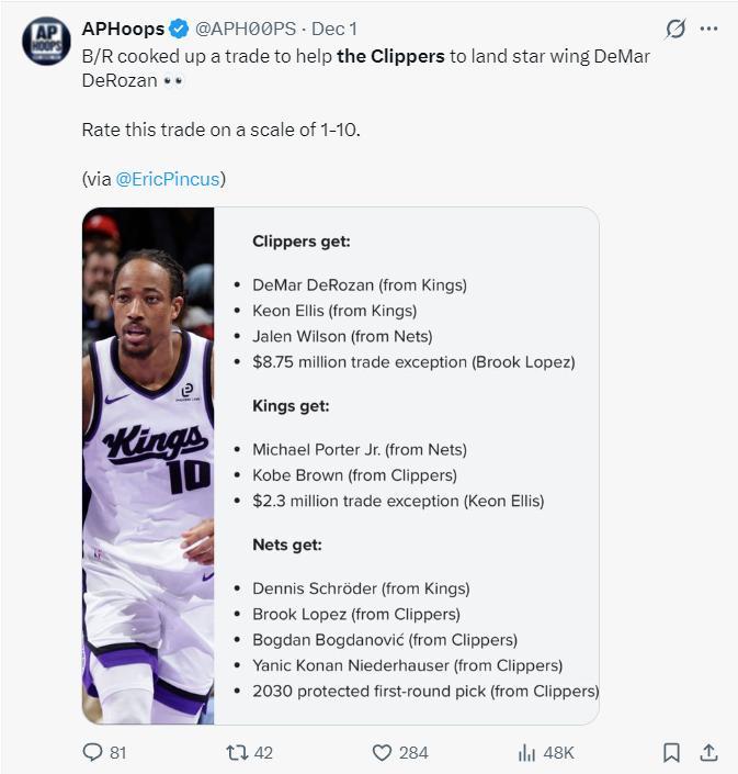 美媒APHoos爲快船建議了多筆交易,第一筆是快船、國王、籃網進行交易,德羅贊、基翁-埃利斯、杰倫-威爾遜加盟快船。