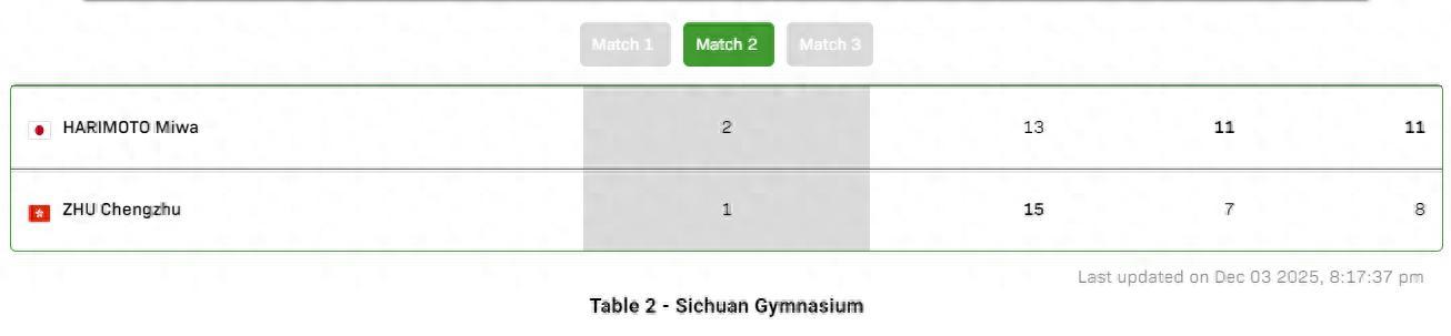 北京時間12月3日,混團世界盃第二階段,日本隊VS中國香港隊的比賽,第二盤日乒一姐17歲張本美和遇上28歲的朱成竹,張本美和在0-1落後的情況下完成2-1逆轉,三局比分:13-15、11-7、11-8。
